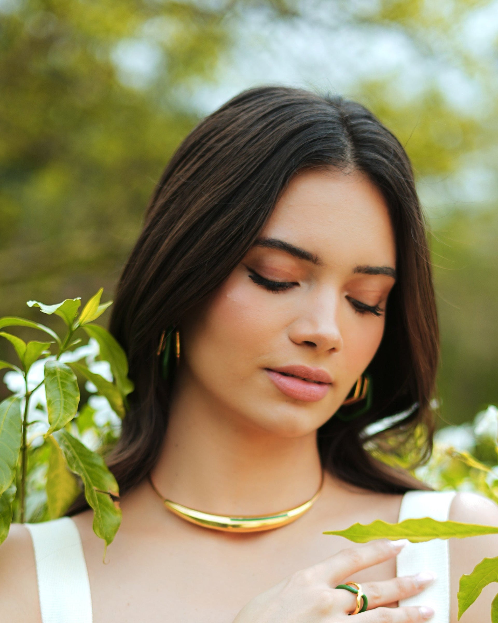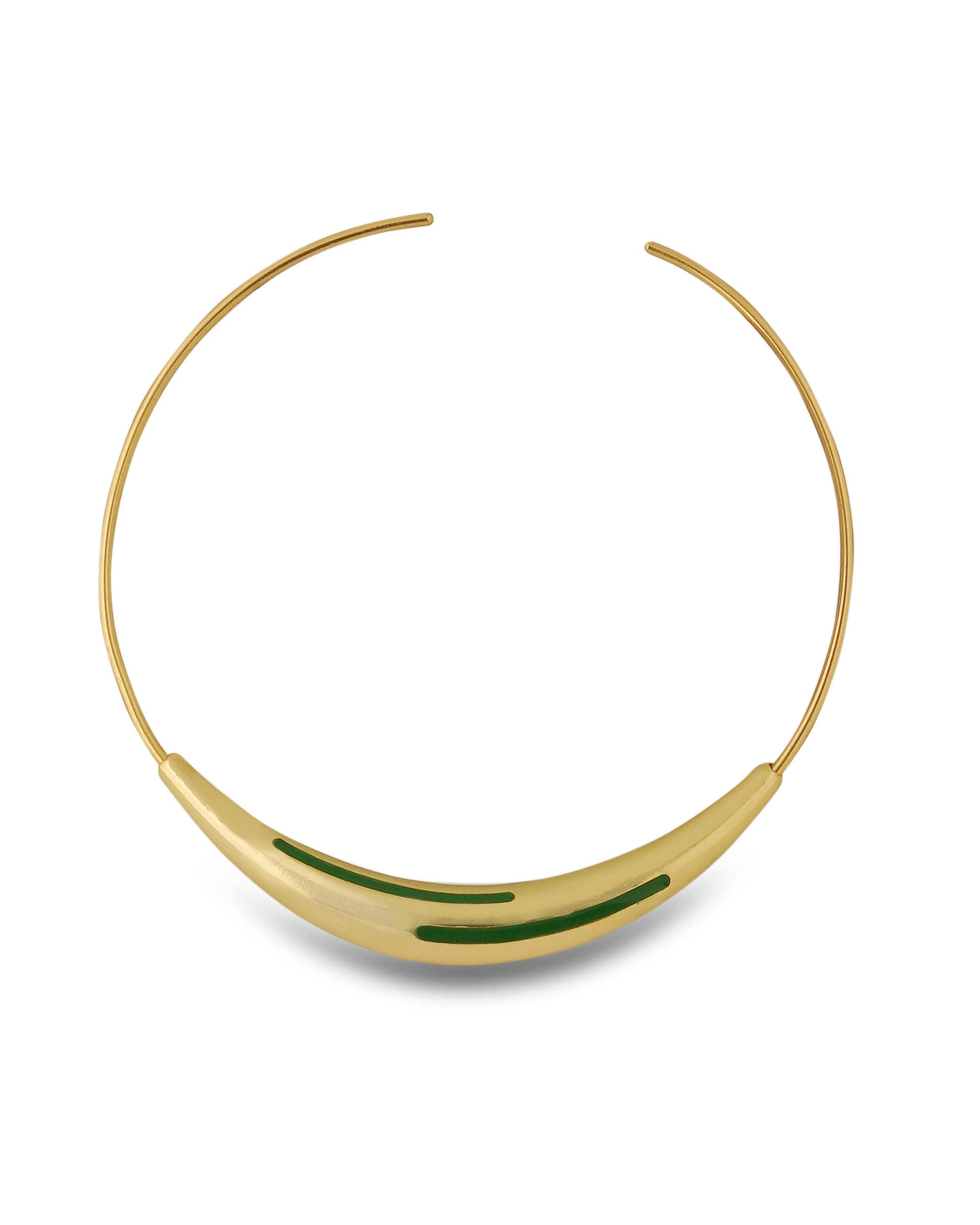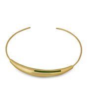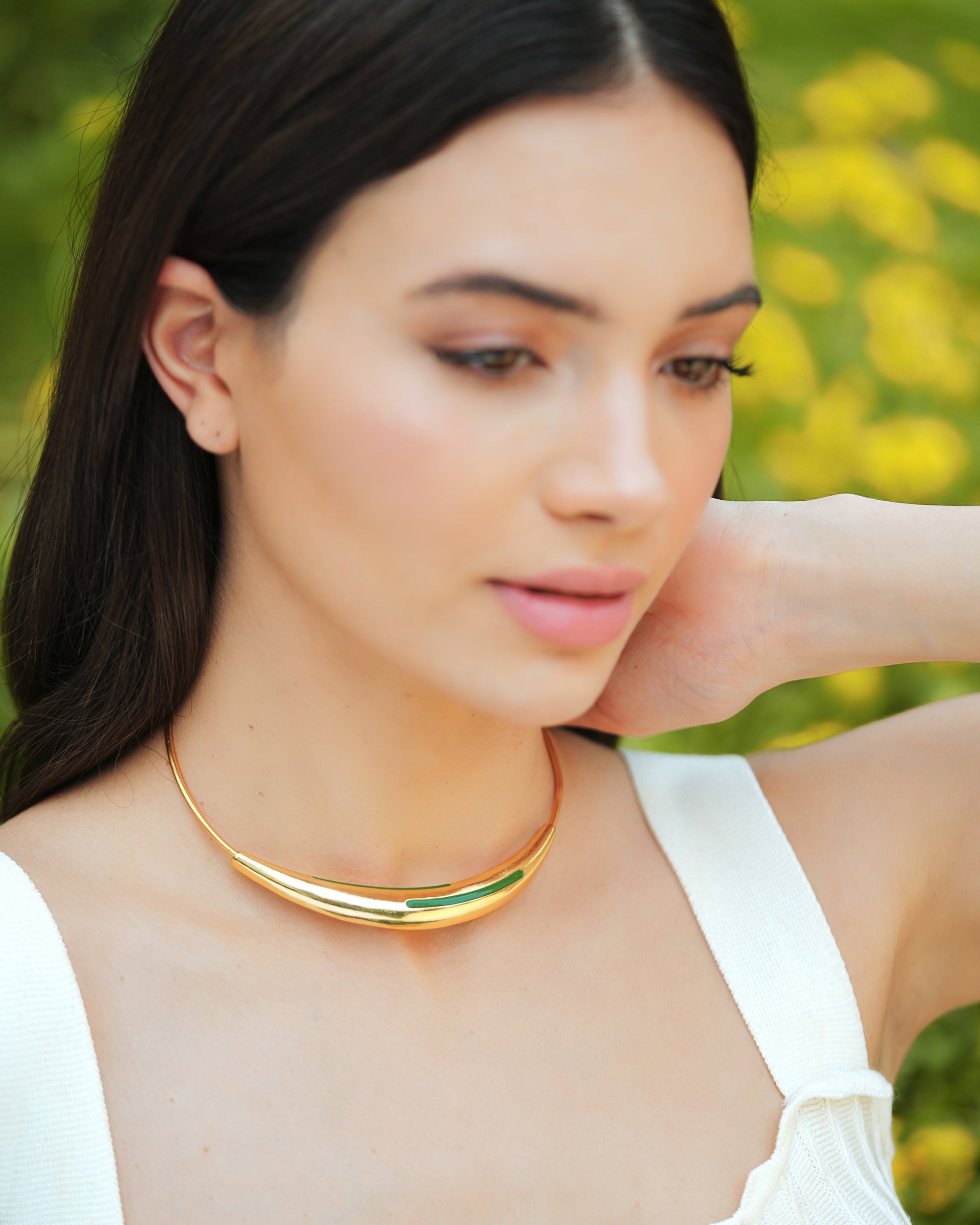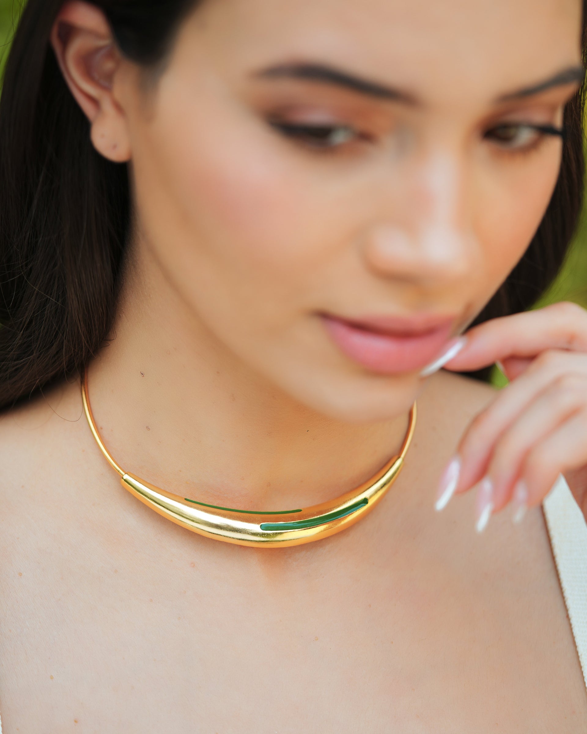 Radiate elegance with the Aurelia Green Enamel Gold Necklace, a sleek and contemporary collar-style design that makes a bold statement. Featuring a fluid gold-tone structure accented with vivid green enamel inlays, this piece blends modern minimalism with artistic flair. The necklace's sculptural silhouette hugs the neckline gracefully, making it perfect for both elevated day wear and sophisticated evenings out.