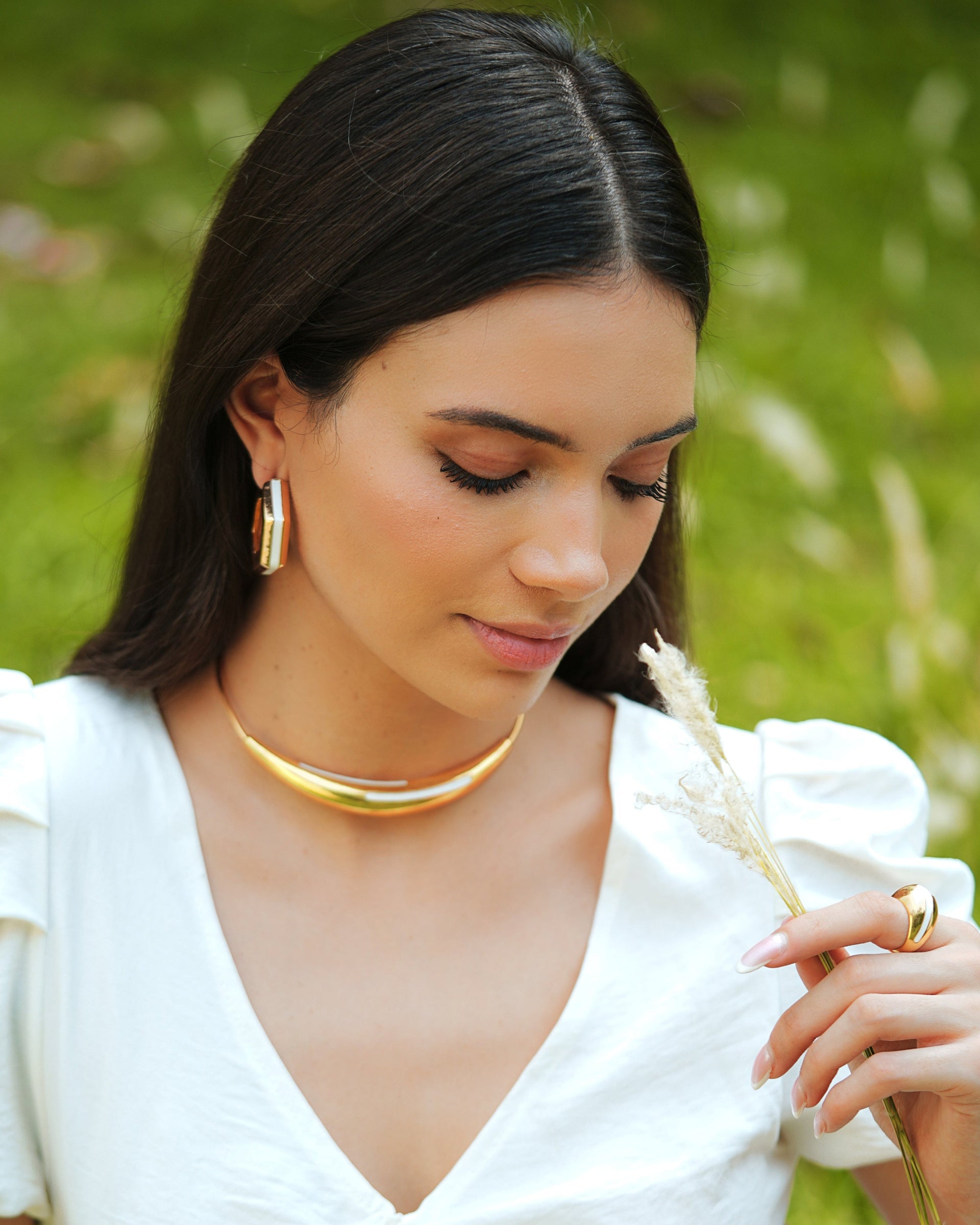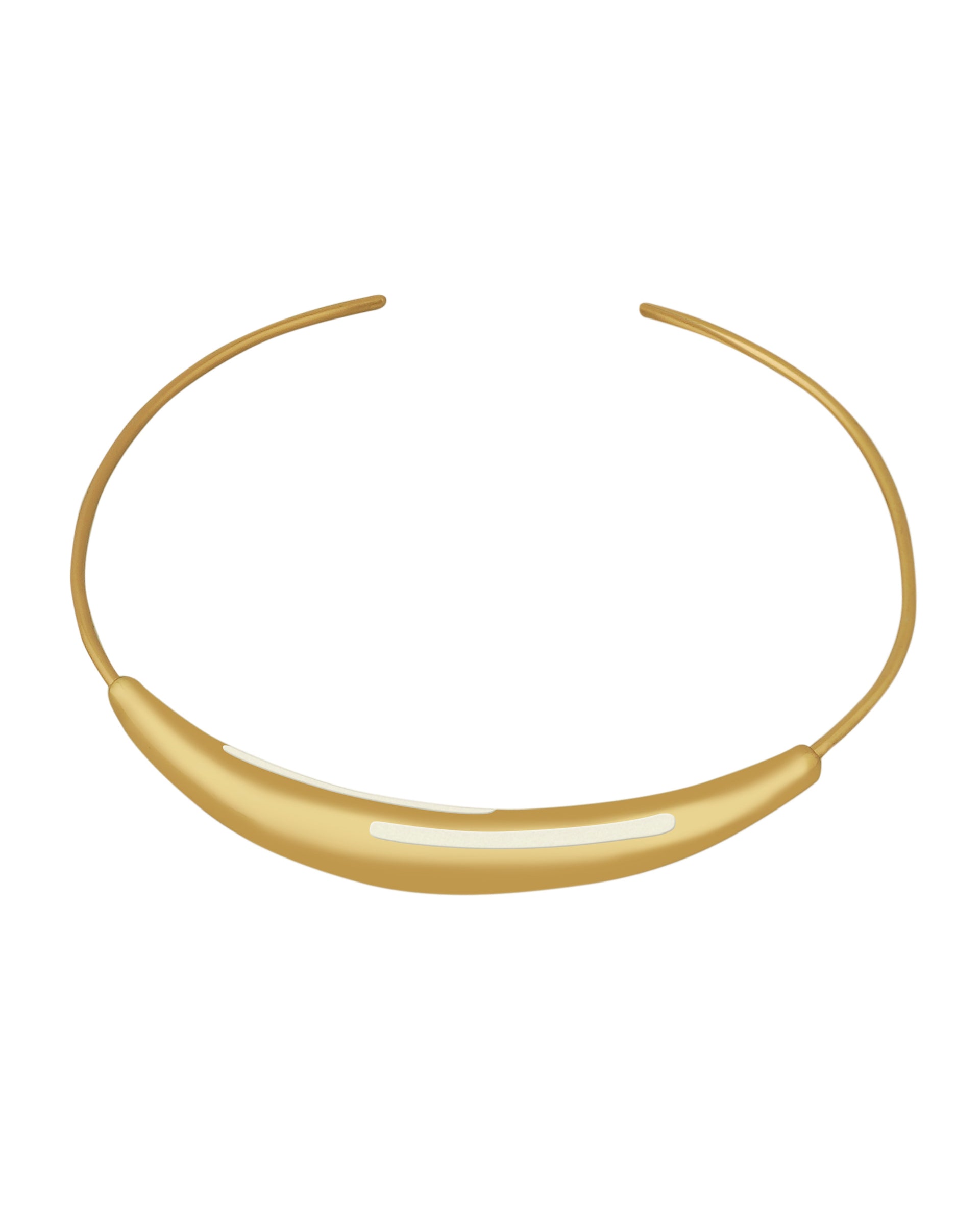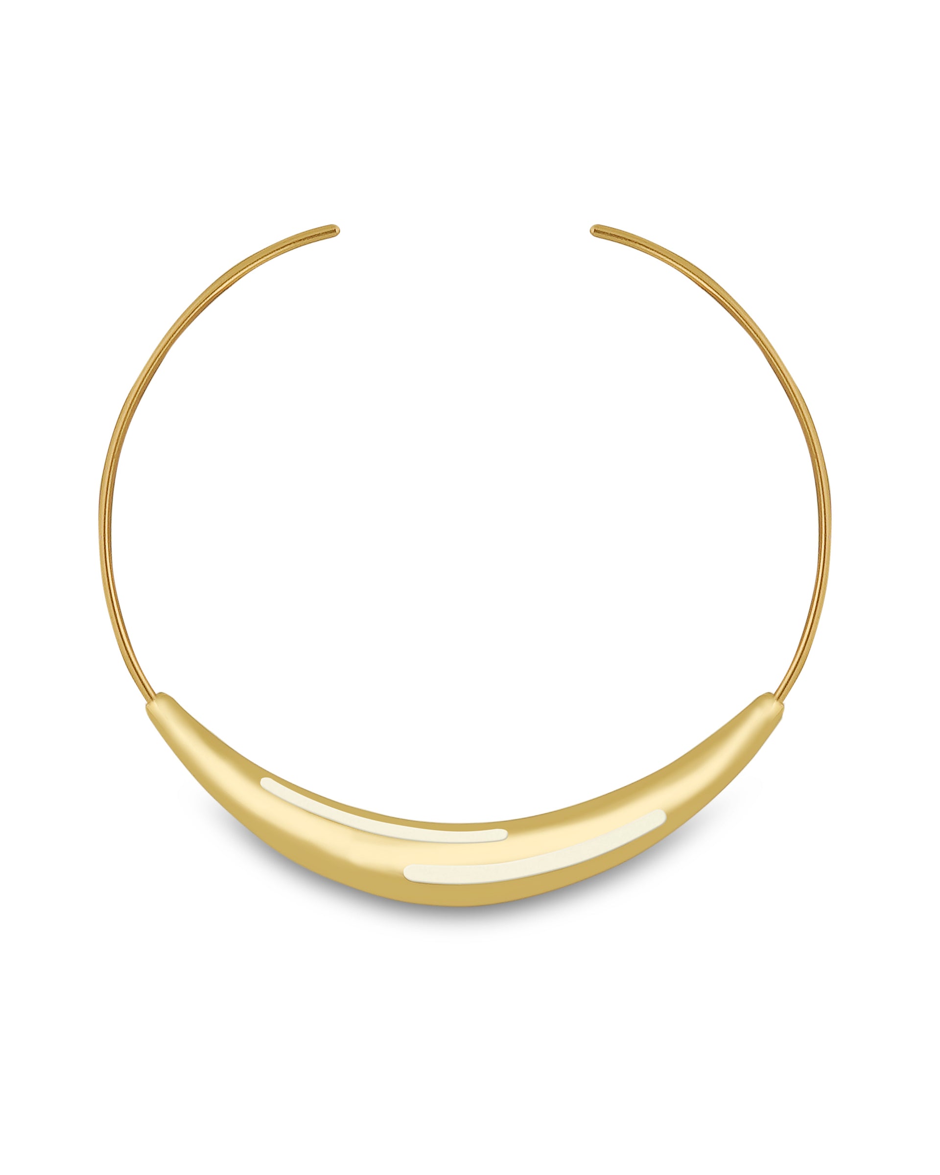 Elevate your look with the Aurelia White Enamel Gold Necklace, a refined collar-style piece that exudes modern sophistication. Designed with a sleek gold-tone arc and finished with crisp white enamel inlays, this necklace offers a clean, contemporary aesthetic that transitions effortlessly from day to night. The smooth, sculptural form sits elegantly at the collarbone, making it a standout addition to any wardrobe.
