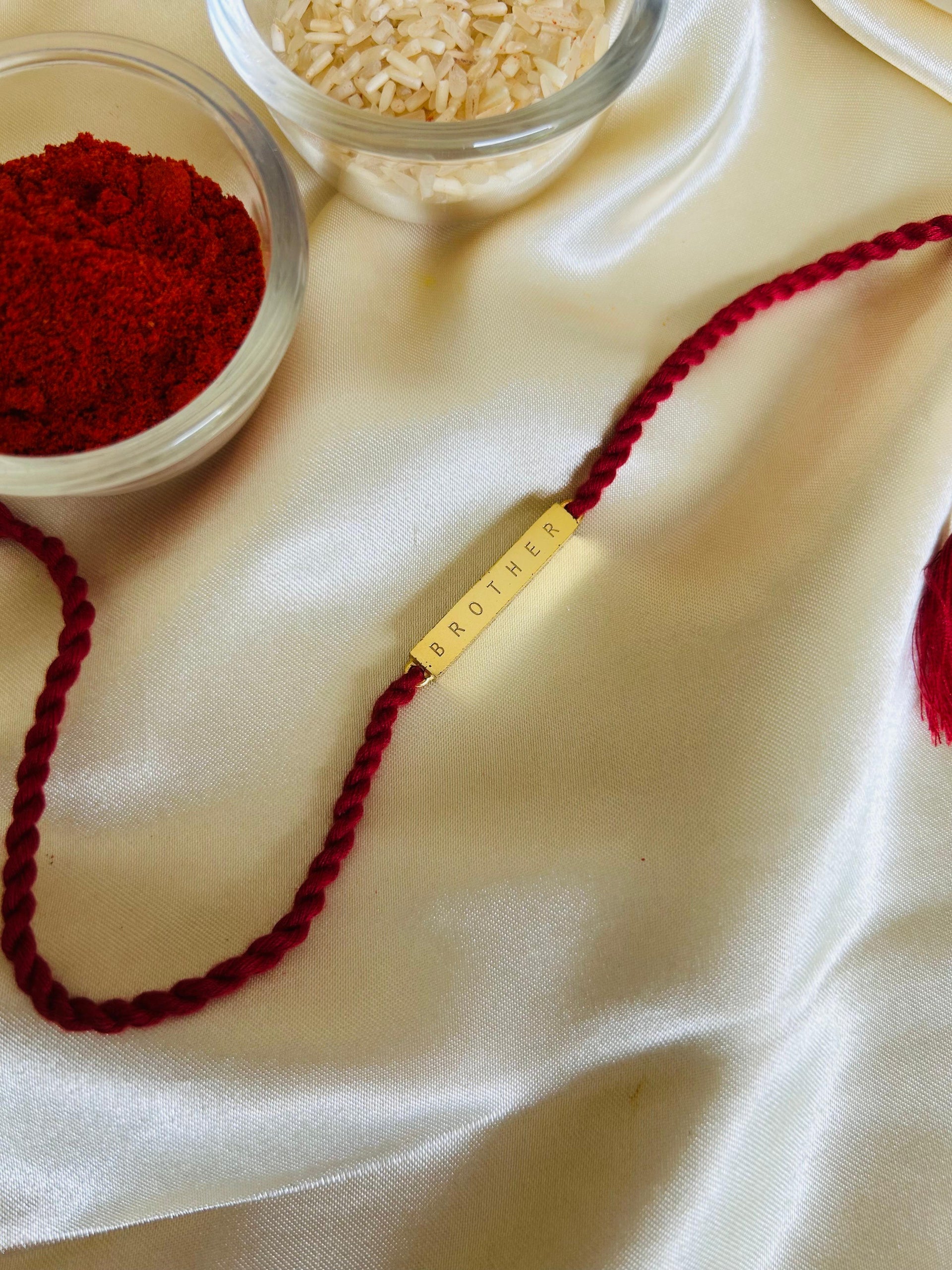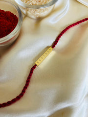This Rakhi carries a heartfelt and direct message with a gold-toned rectangular plate engraved with the word “BROTHER.” The clean, minimal design is paired with a rich red twisted thread, symbolizing love and strength. Simple yet deeply meaningful, this Rakhi is a beautiful way to celebrate the bond between siblings with elegance and warmth.