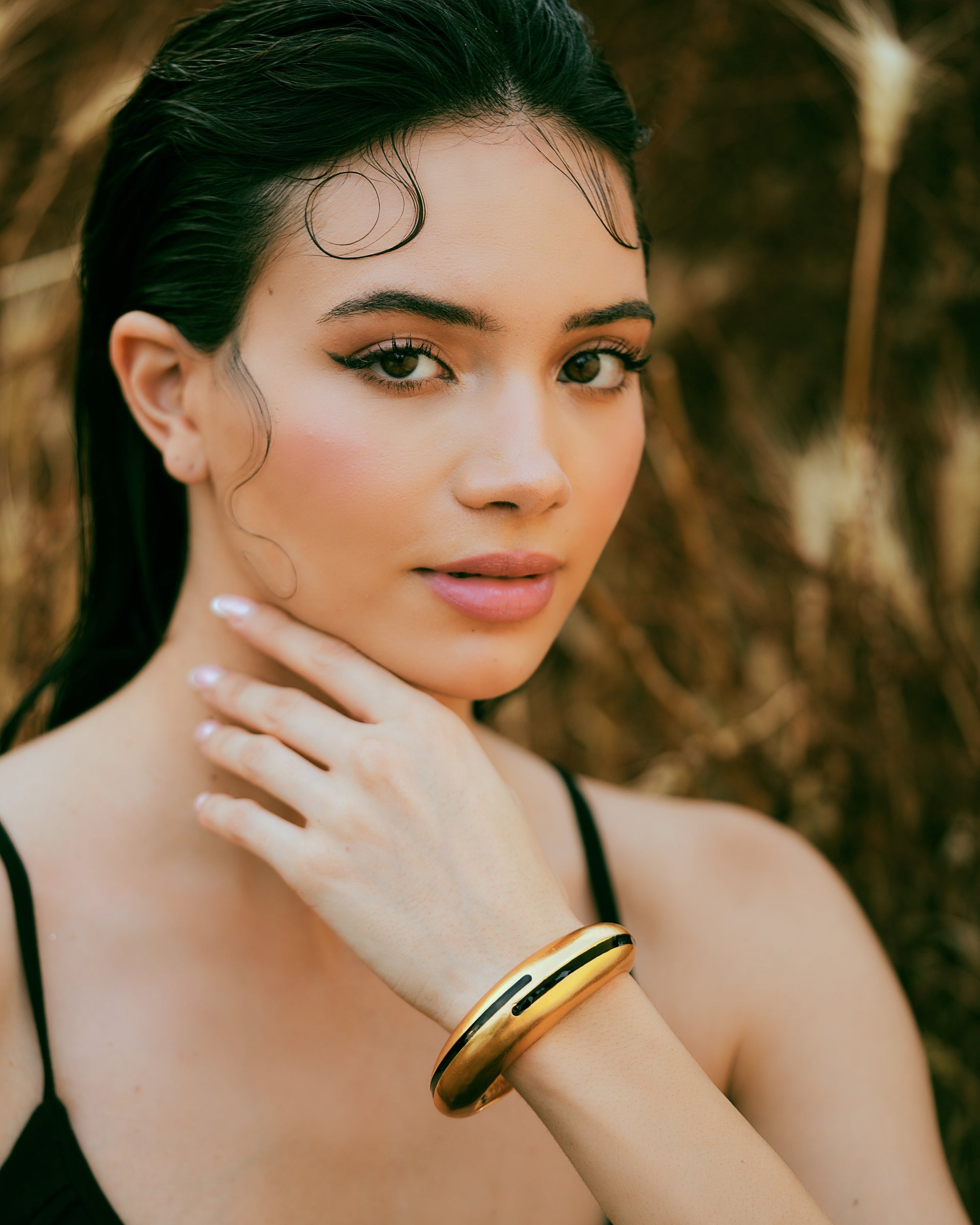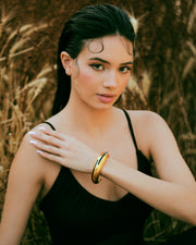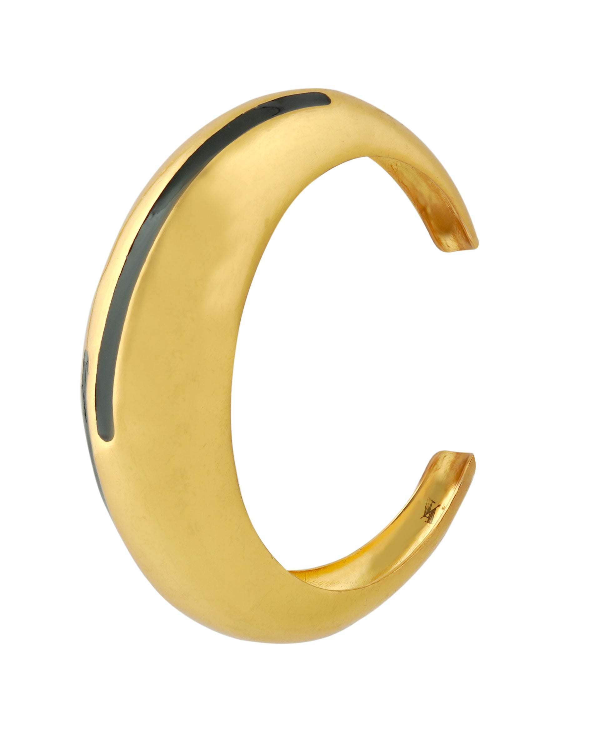 Elevate your accessory game with the Circlet Black Enamel Gold Bangle, a bold yet elegant statement piece designed for modern sophistication. Crafted with a sleek, polished gold finish and accented with a subtle black enamel inlay, this bangle exudes contemporary charm and artistic flair. Its sculptural form hugs the wrist comfortably, making it perfect for both everyday wear and special occasions.