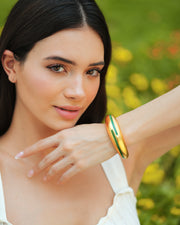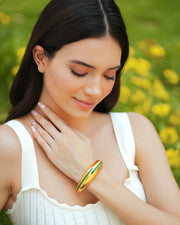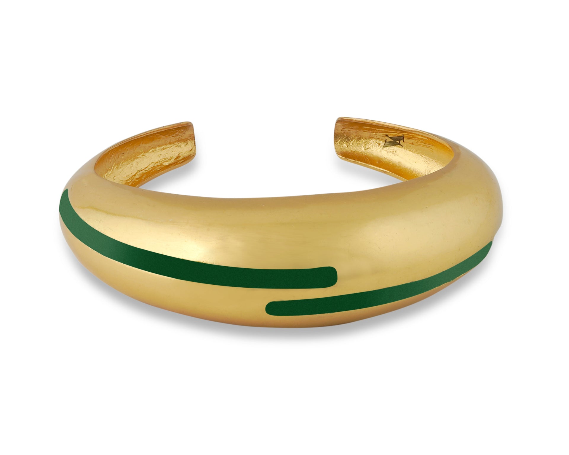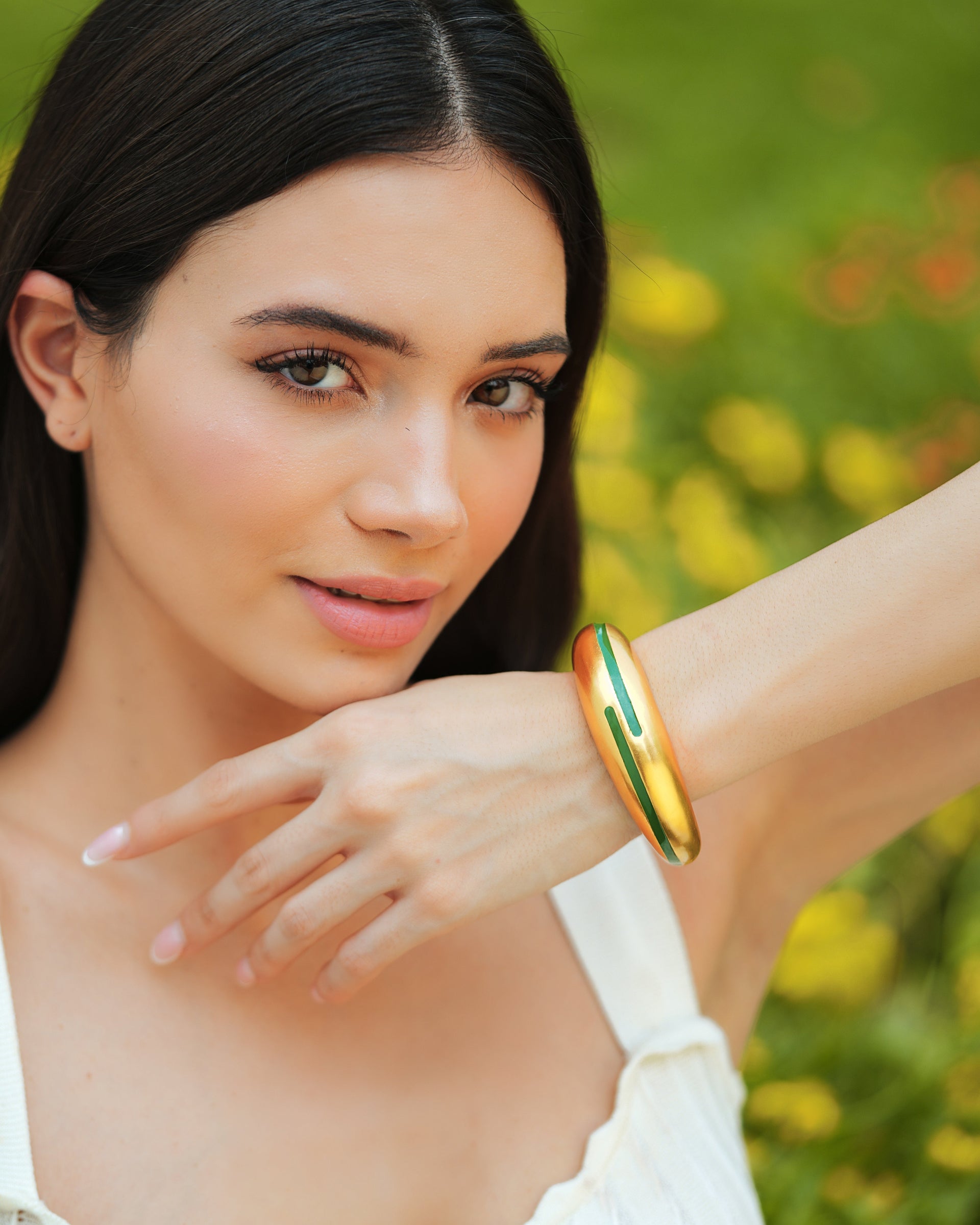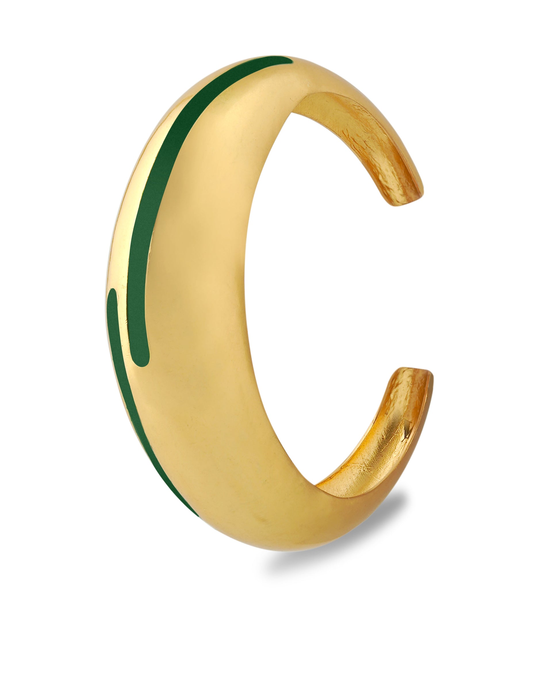 Elevate your accessory game with the Circlet Green Enamel Gold Bangle, a bold yet elegant statement piece designed for modern sophistication. Crafted with a sleek, polished gold finish and accented with a subtle green enamel inlay, this bangle exudes contemporary charm and artistic flair. Its sculptural form hugs the wrist comfortably, making it perfect for both everyday wear and special occasions.