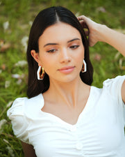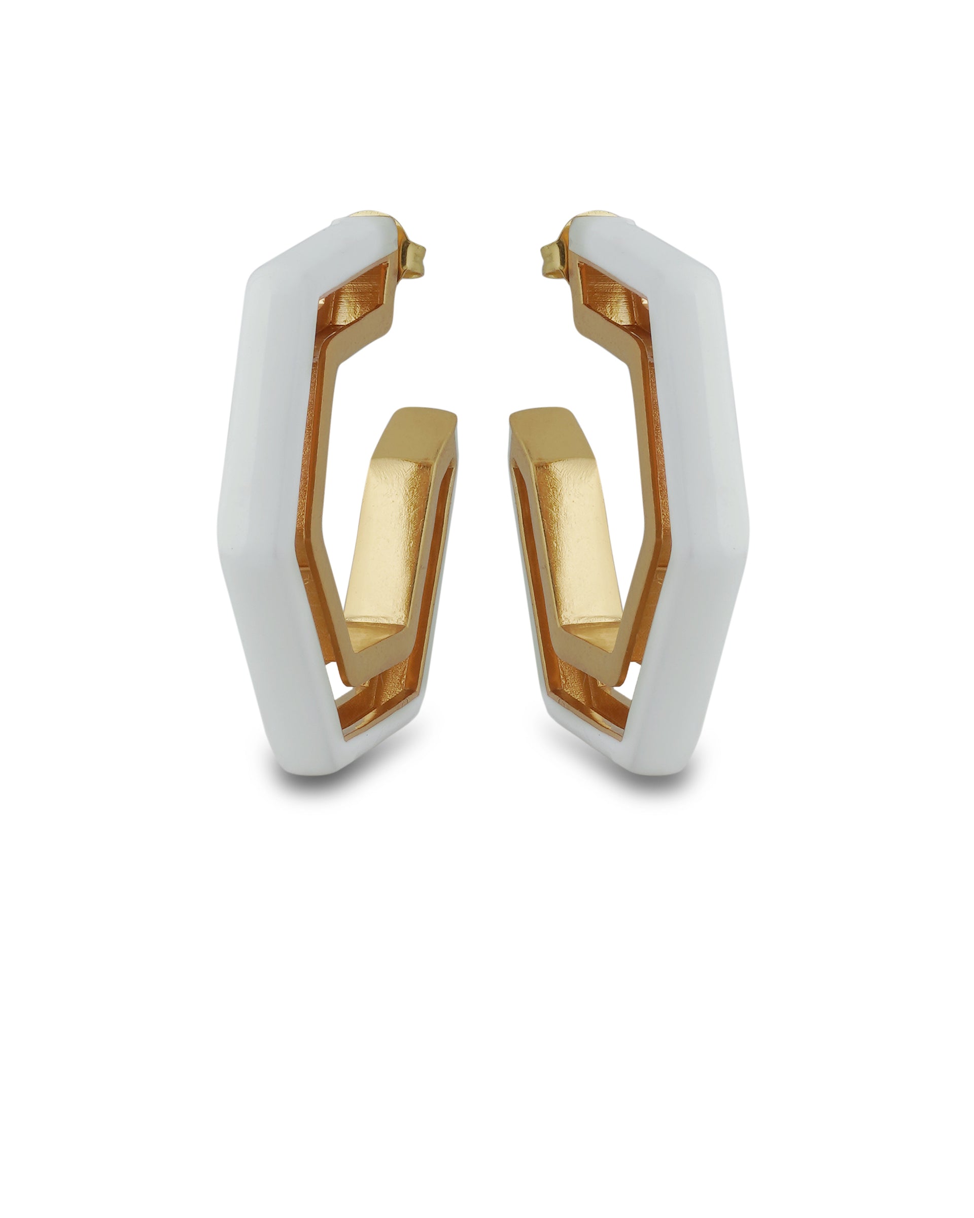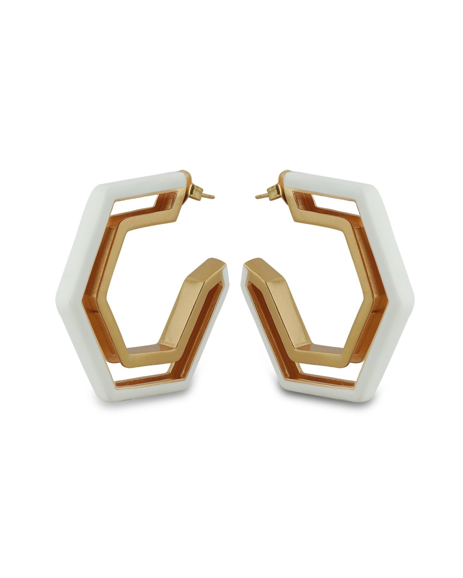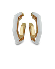 Make a bold impression with these statement hexagonal hoop earrings, where sharp lines meet smooth curves in perfect harmony. Crafted in high-shine gold and edged with a white enamel, these earrings are a modern twist on classic geometry. The angular silhouette offers a confident, contemporary flair, while the rich white border adds a striking contrast that captures the light—and attention. Ideal for both standout day wear and glamorous evenings, these earrings are designed for those who dare to be different.