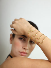 Enhance your look with the Billow Bangle, inspired by the fluid movements of the ocean. This elegant piece, with its flowing lines and gold finish, adds sophistication to any outfit, making it a versatile accessory for both casual and formal occasions.