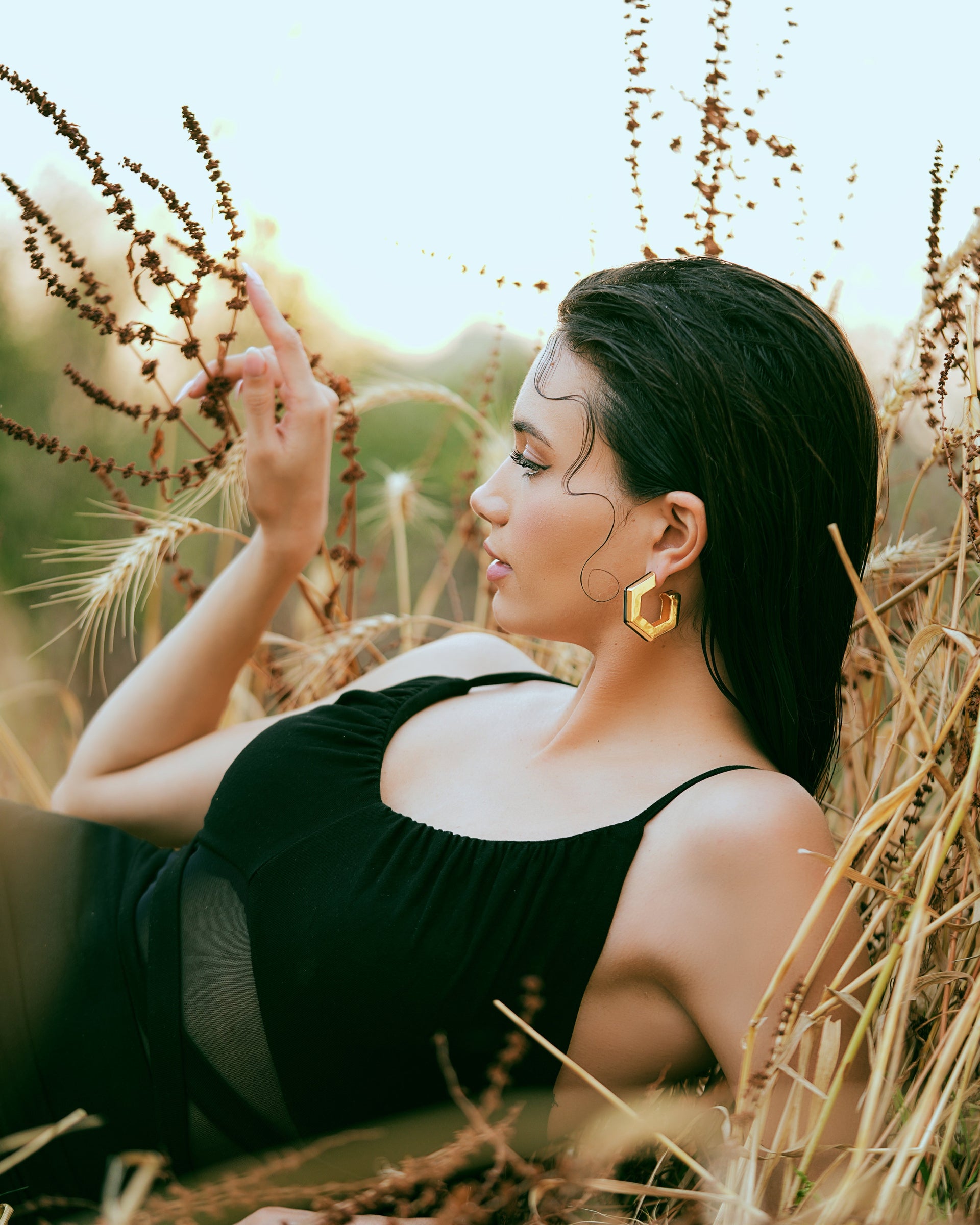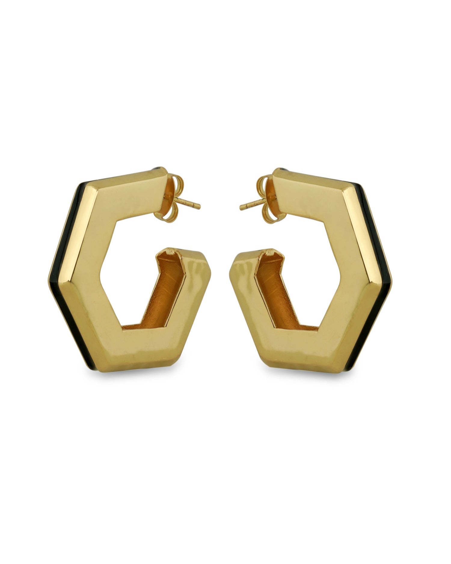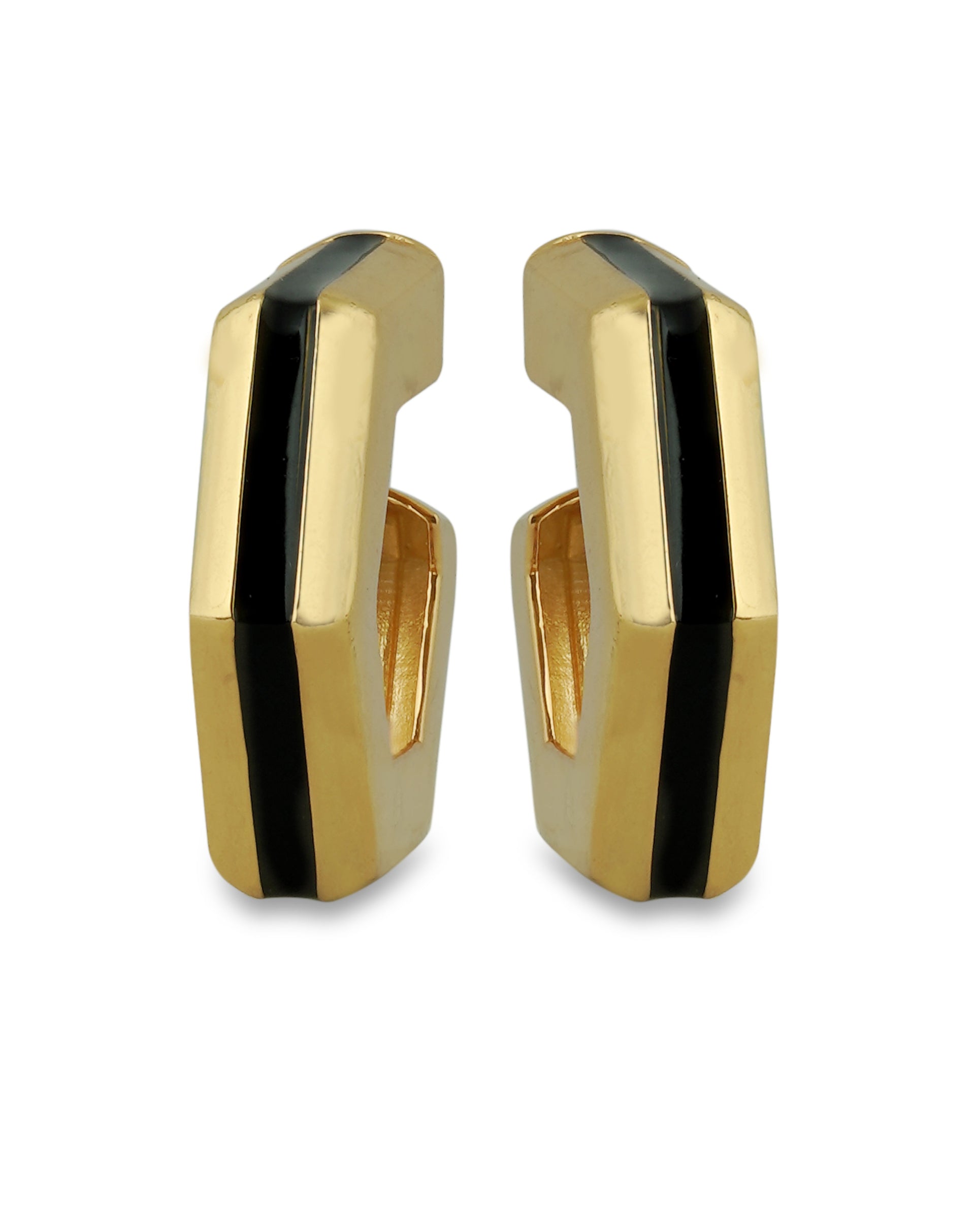 Turn heads with these bold hexagonal hoop earrings, a stunning fusion of edgy design and timeless elegance. Crafted in high-polish gold with a sleek black enamel accent, these earrings add a fresh, modern twist to your accessory game. Their sculptural silhouette and striking color contrast make them the perfect statement piece for both casual chic and sophisticated ensembles. Designed to stand out, these earrings exude confidence, style, and a touch of avant-garde charm.