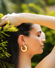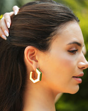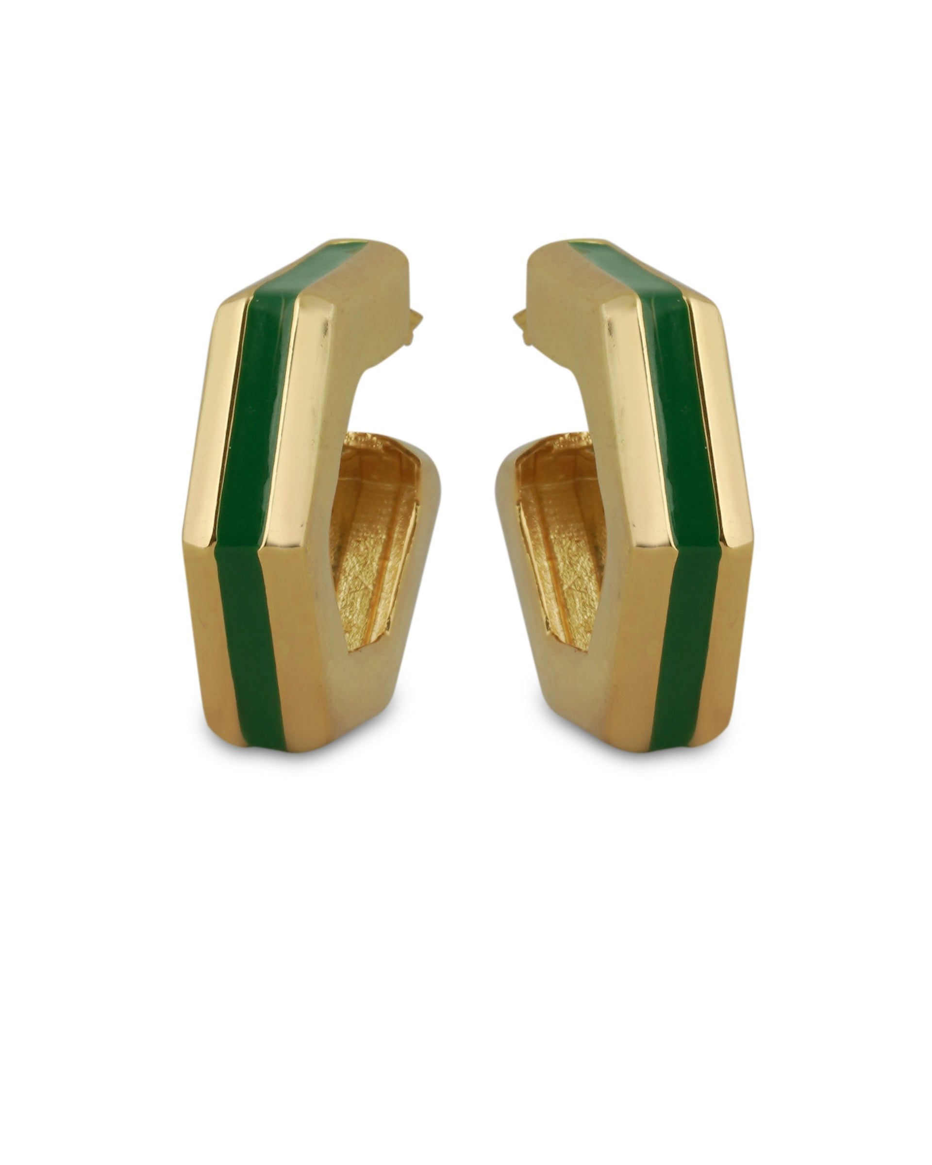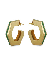 Turn heads with these bold hexagonal hoop earrings, a stunning fusion of edgy design and timeless elegance. Crafted in high-polish gold with a sleek green enamel accent, these earrings add a fresh, modern twist to your accessory game. Their sculptural silhouette and striking color contrast make them the perfect statement piece for both casual chic and sophisticated ensembles. Designed to stand out, these earrings exude confidence, style, and a touch of avant-garde charm.