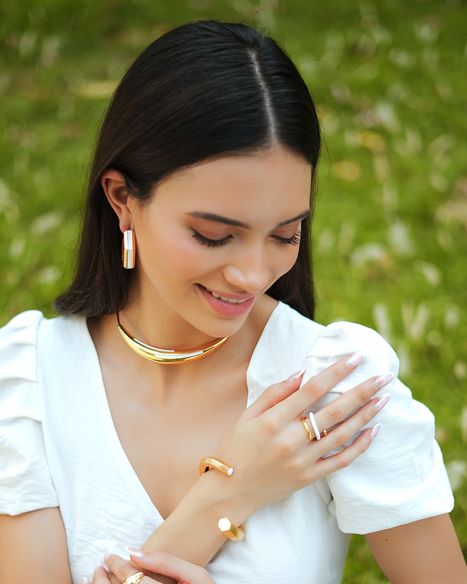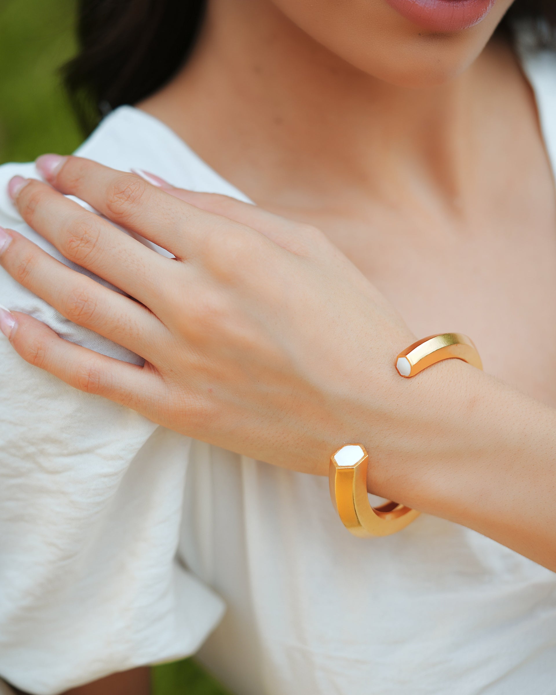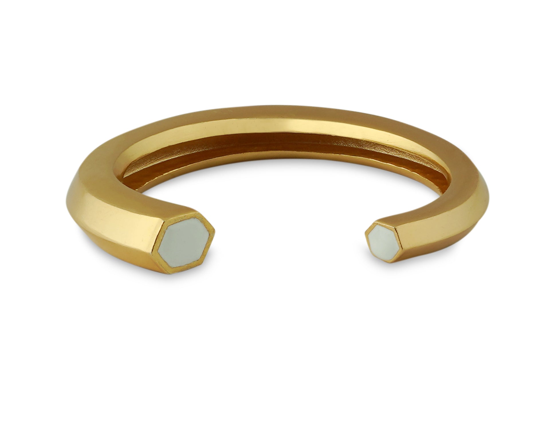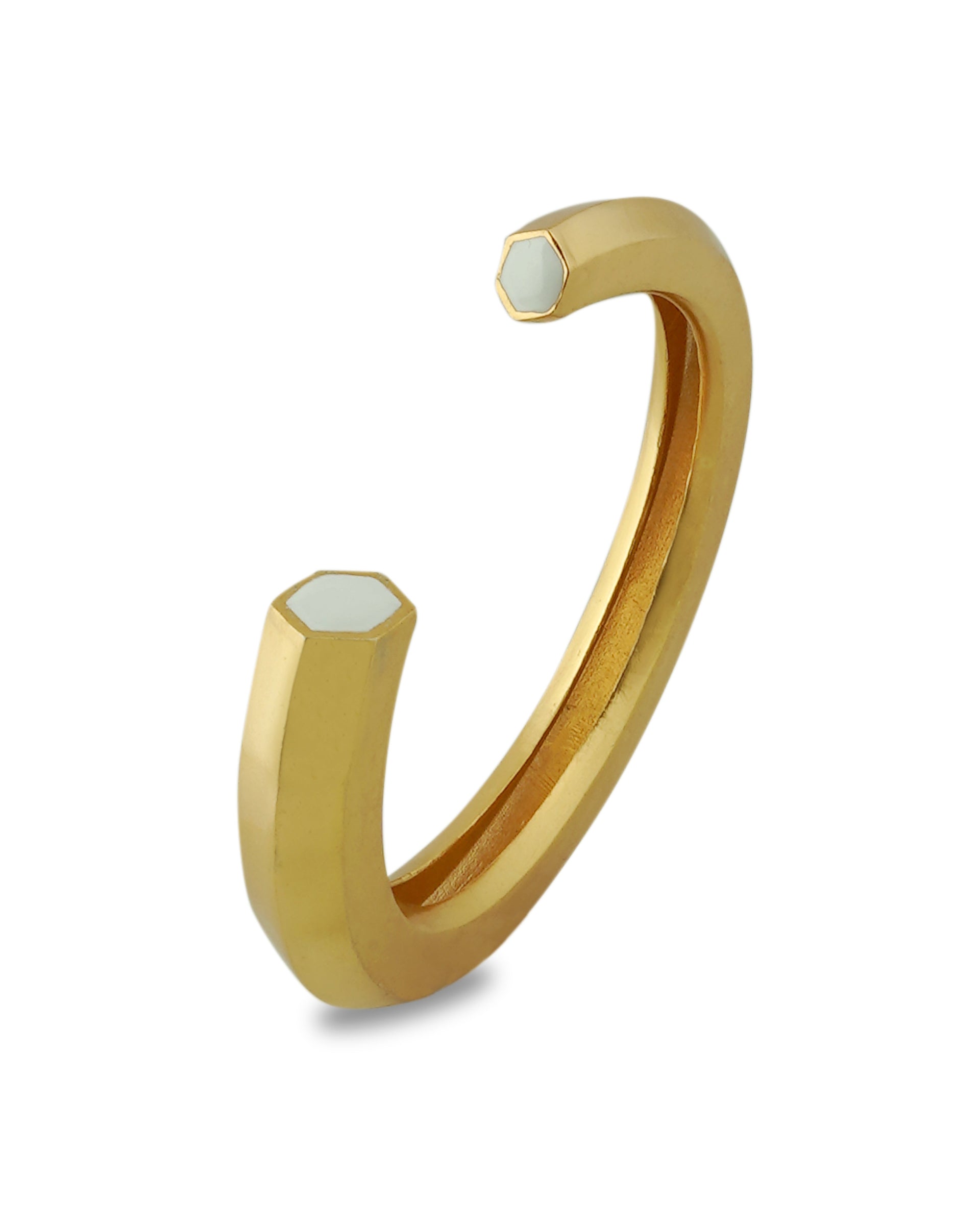 Make a striking statement with the Hexa White Enamel Gold Cuff, a sculptural masterpiece that blends bold form with refined elegance. Featuring a twist-open design for effortless wear, this cuff showcases hexagon-shaped white enamel accents set in a luminous gold-tone finish. The clean lines and architectural silhouette create a modern yet timeless appeal, perfect for elevating both casual and formal looks.