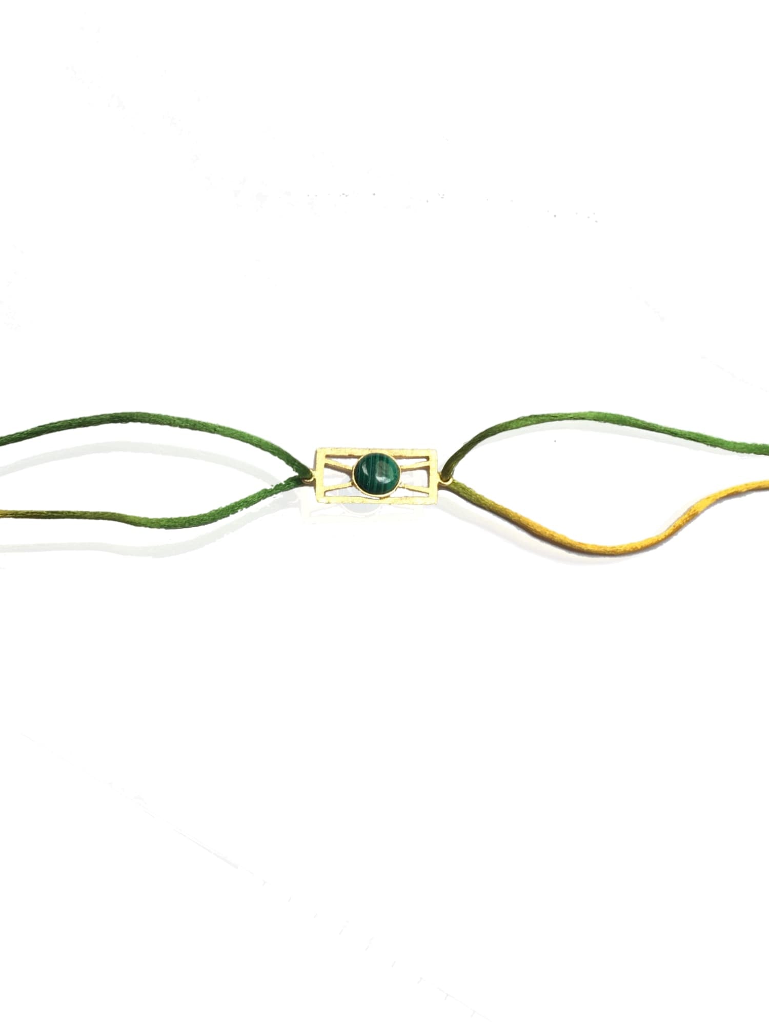This Rakhi features a sleek and contemporary design with a rectangular gold-toned centerpiece holding a deep green gemstone. The green and mustard-yellow threads add a fresh and earthy touch, making it stand out from traditional color palettes. The clean geometry of the centerpiece paired with the vibrant colors makes this Rakhi ideal for someone who appreciates minimalist elegance with a modern flair