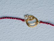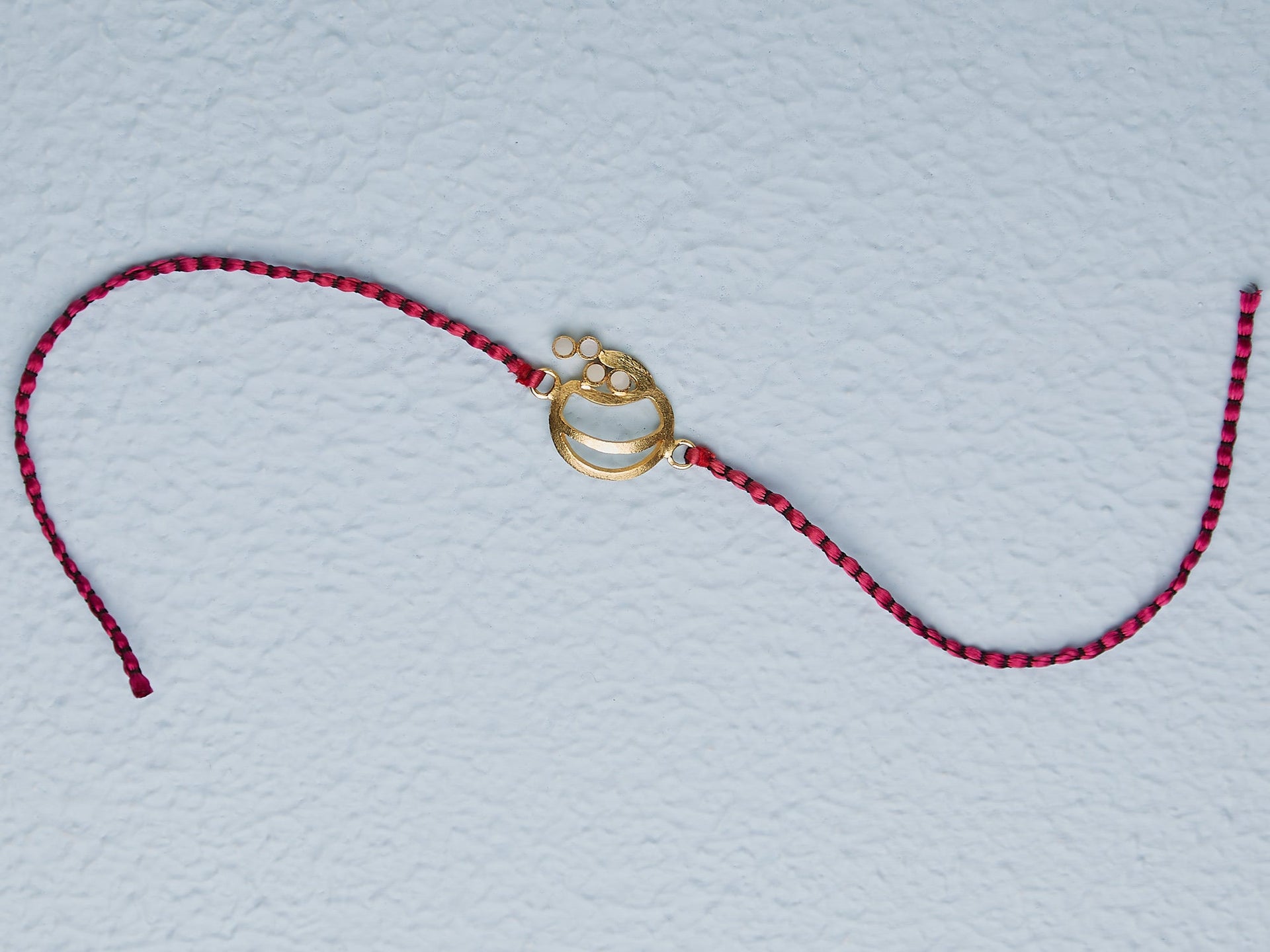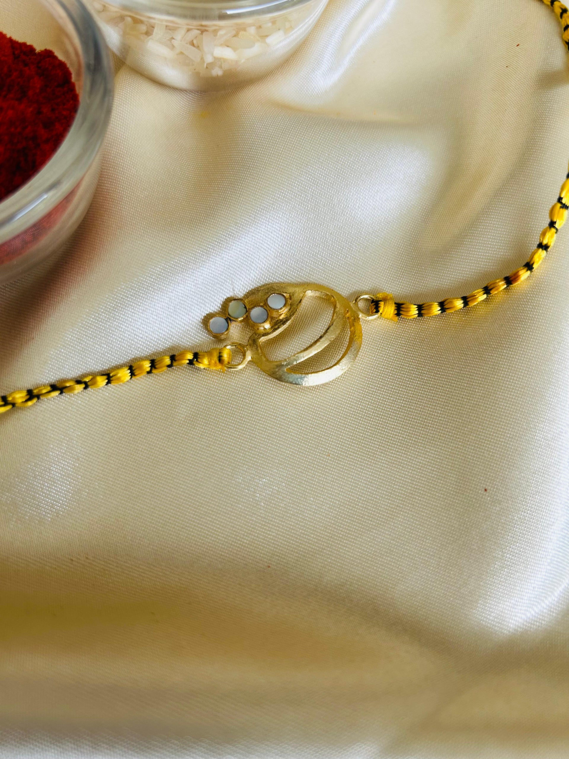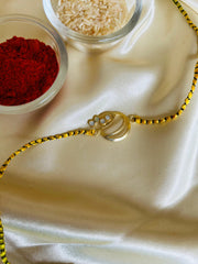 This Rakhi features a modern and minimalistic design with a golden centerpiece shaped in an abstract circular form, including curved lines and small circular accents on one side. The centerpiece has a matte-textured finish that adds a touch of sophistication. It is tied with a vibrant red and black braided thread, giving it a bold and festive appearance. This Rakhi combines contemporary style with traditional elements, making it a unique symbol of love and protection for Raksha Bandhan.