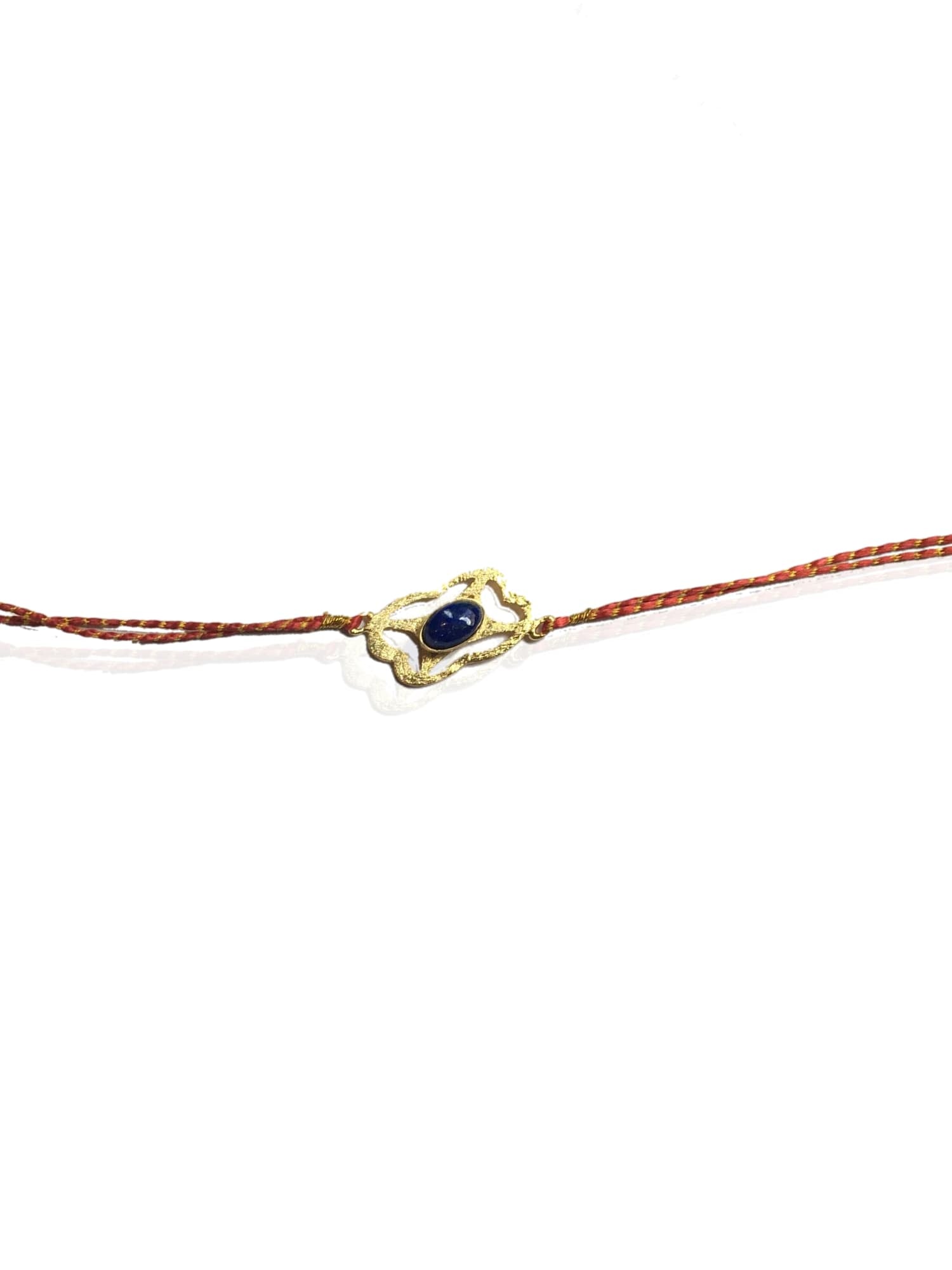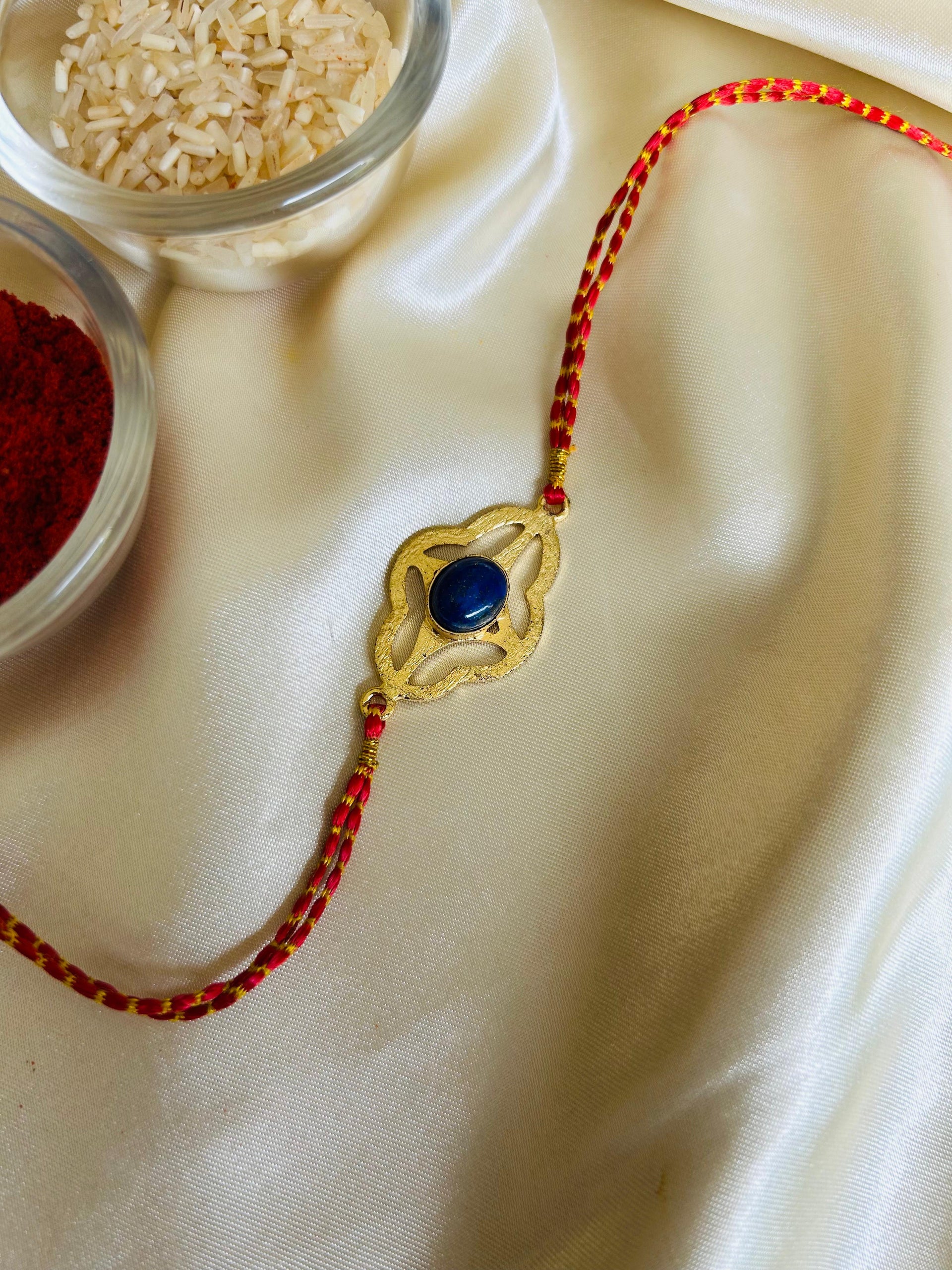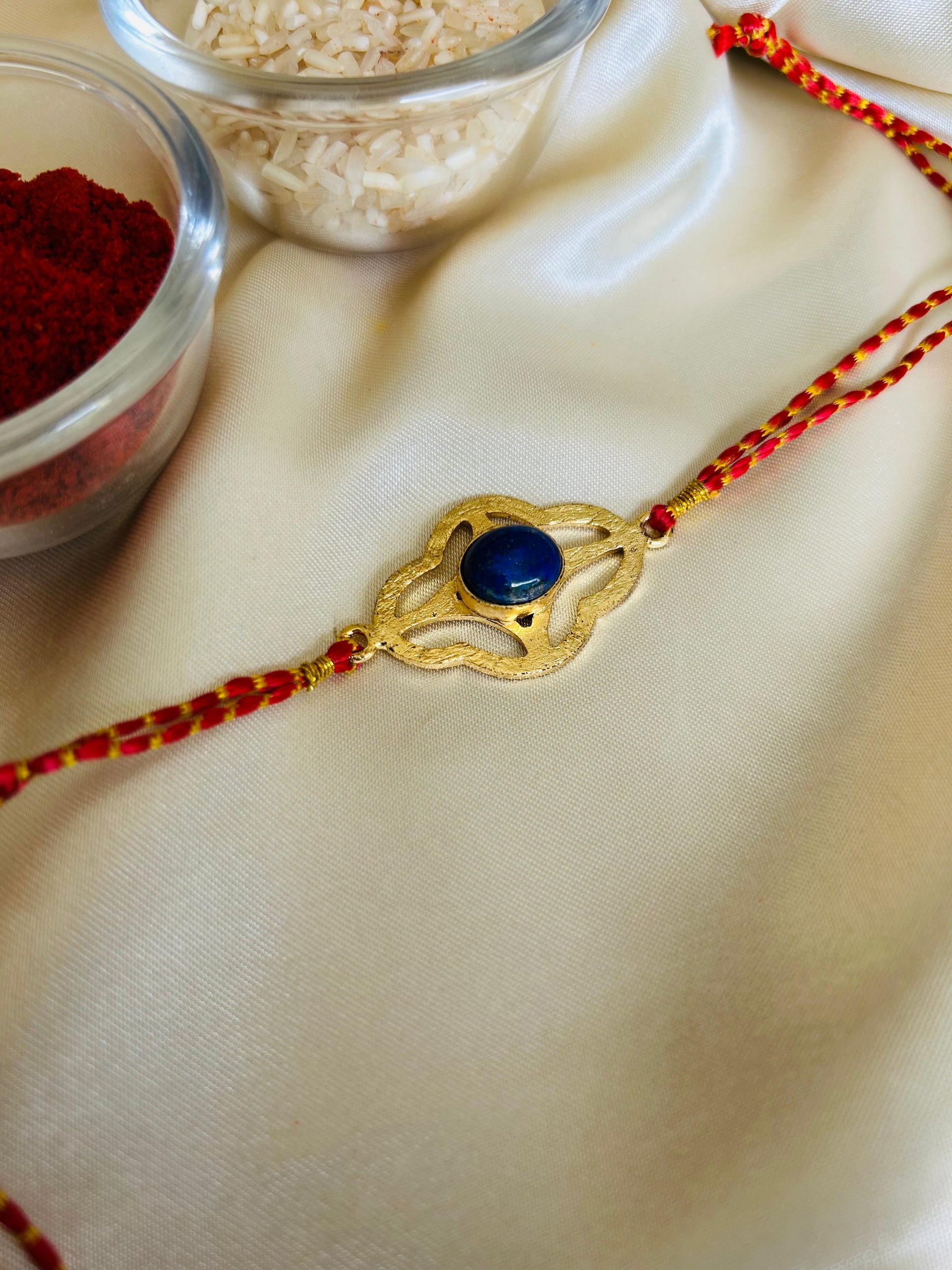 This Rakhi features a deep blue stone set in an ornate gold-toned frame, offering a traditional and regal aesthetic. The red and gold twisted thread complements the centerpiece beautifully, making it a perfect blend of elegance and symbolism. The design evokes protection and spiritual energy, making it ideal for someone who appreciates classic, meaningful styles with a touch of richness.