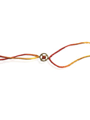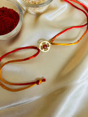 This Rakhi showcases a minimal yet symbolic design, with a circular gold-toned centerpiece featuring a red stone at its heart. The threads are a vibrant blend of red, orange, and yellow hues, evoking warmth, energy, and festivity. The circular motif can symbolize unity, eternity, and protection, making this Rakhi ideal for someone who values simplicity with deep cultural meaning. Its radiant color palette gives it a joyful and auspicious look, perfect for the Raksha Bandhan celebration.