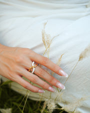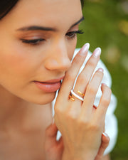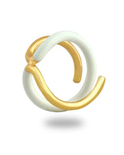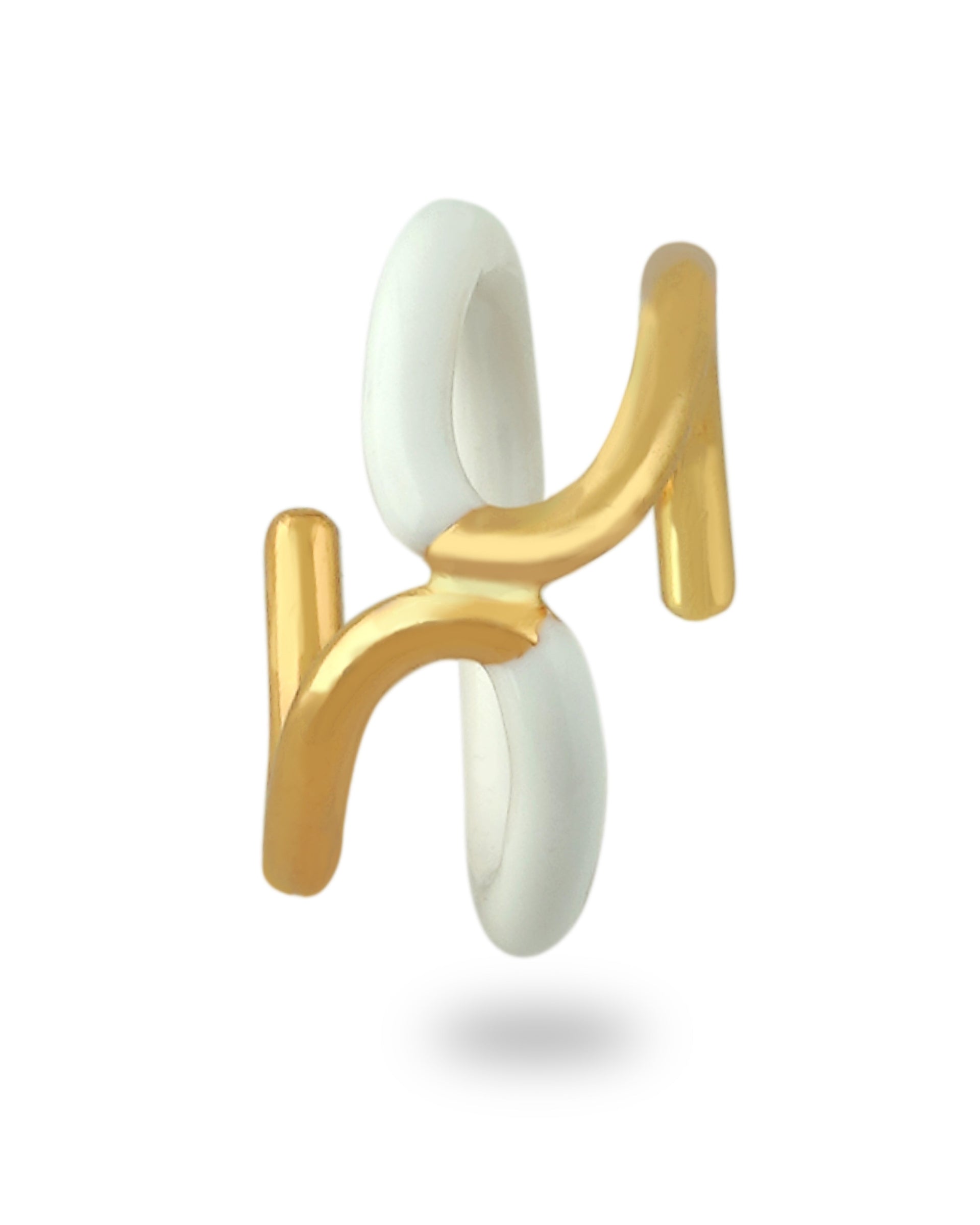 Unleash dual elegance with this captivating reversible ring, designed to twist and transform with your mood. Featuring a bold interplay of emerald white and radiant gold, its fluid, interlocking design offers two distinct looks in one sculptural piece. Whether you wear it with the white or the gold in focus, this ring brings a modern, artistic edge to your every gesture.