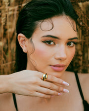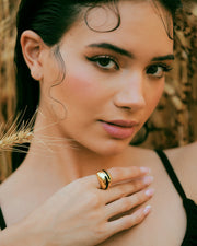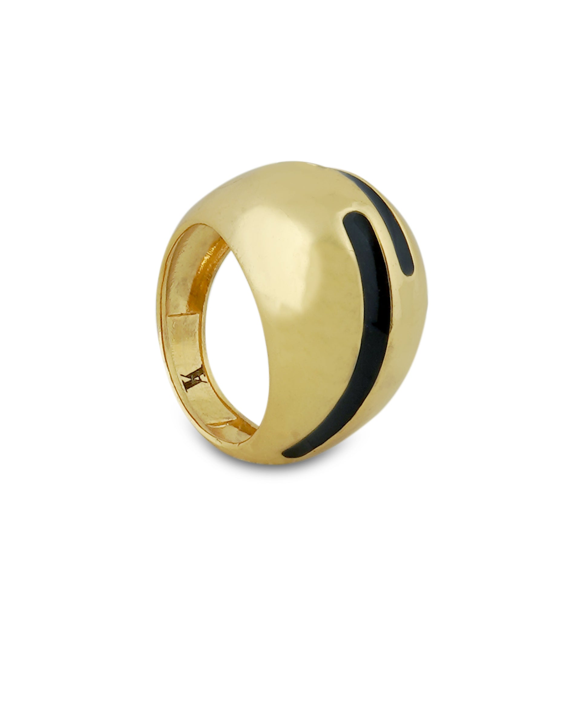 Elevate your everyday elegance with this stunning gold dome ring, accented by a graceful black enamel wave. Its smooth, polished surface reflects light beautifully, while the organic swirl of color adds a fresh, contemporary twist. Perfect for making a subtle yet sophisticated statement, this ring effortlessly blends bold design with timeless charm. Whether worn solo or stacked for impact, it's a must-have for the modern muse.