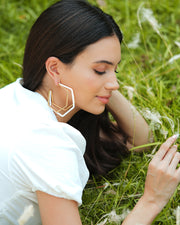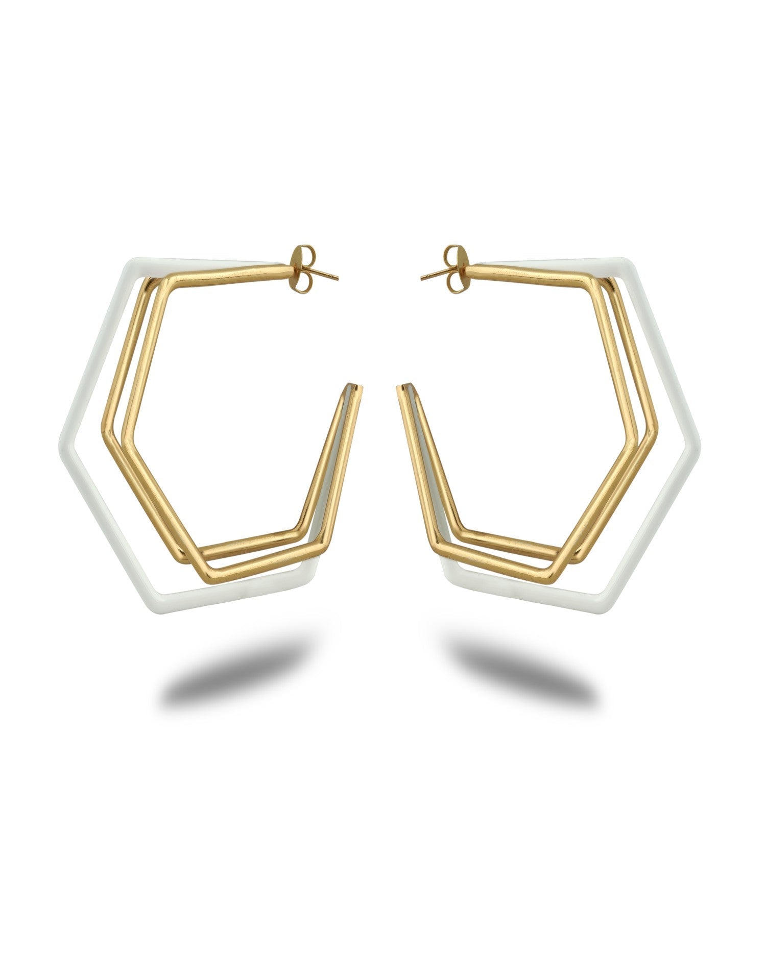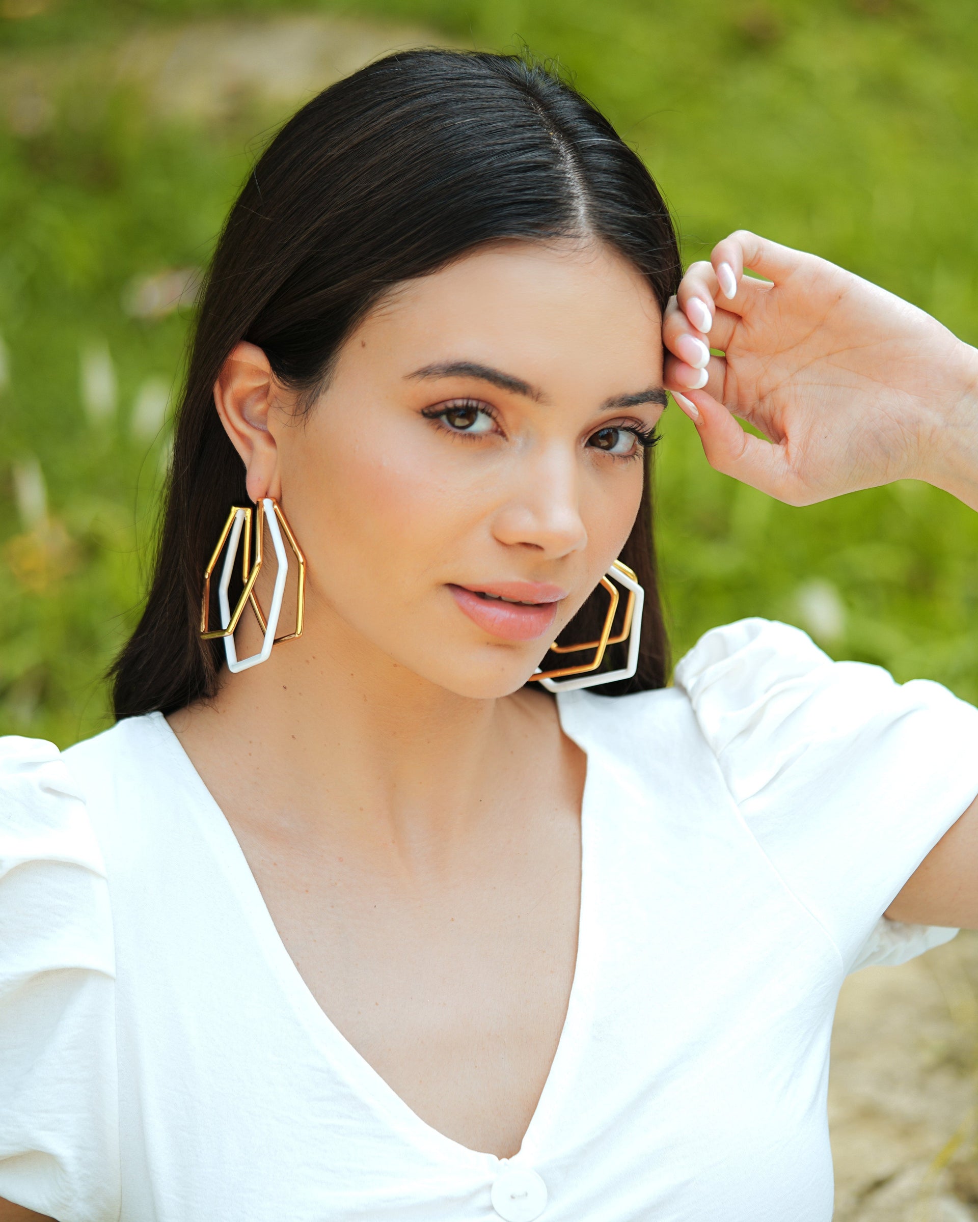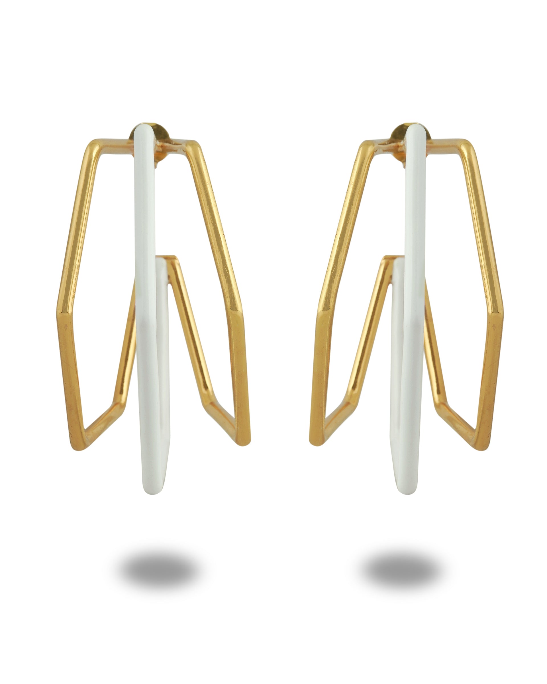 Elevate your style with these striking geometric hoop earrings, where modern elegance meets bold design. Featuring interlocking hexagonal shapes in rich gold and white, these earrings make a statement with their unique structure and vibrant contrast. Perfect for both daytime charm and evening sophistication, they add a touch of contemporary luxury to any look. Lightweight yet eye-catching, they’re the ultimate accessory for the fashion-forward woman.