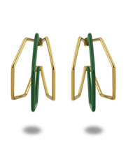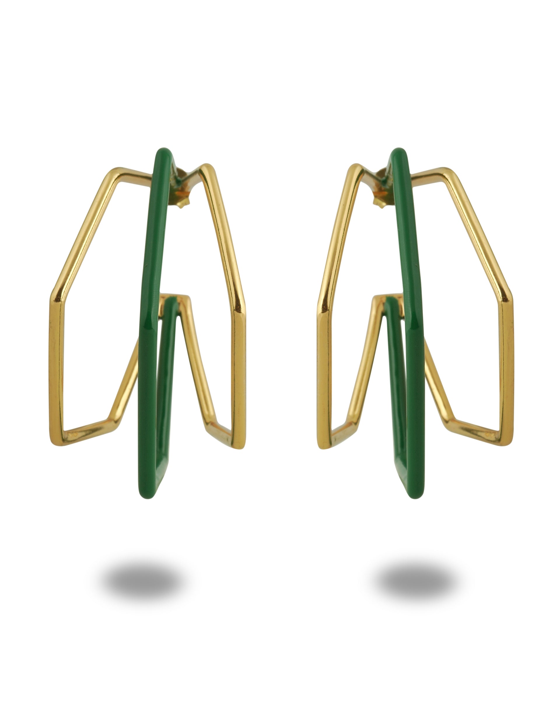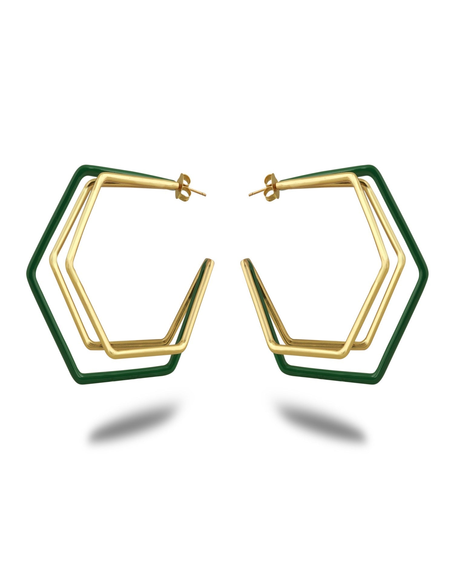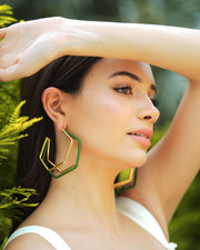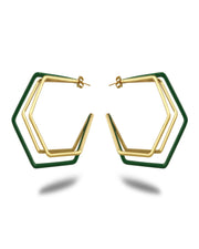 Elevate your style with these striking geometric hoop earrings, where modern elegance meets bold design. Featuring interlocking hexagonal shapes in rich gold and deep green, these earrings make a statement with their unique structure and vibrant contrast. Perfect for both daytime charm and evening sophistication, they add a touch of contemporary luxury to any look. Lightweight yet eye-catching, they’re the ultimate accessory for the fashion-forward woman.