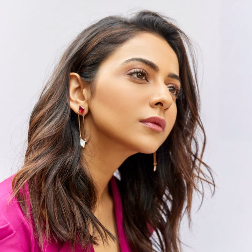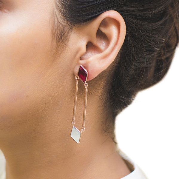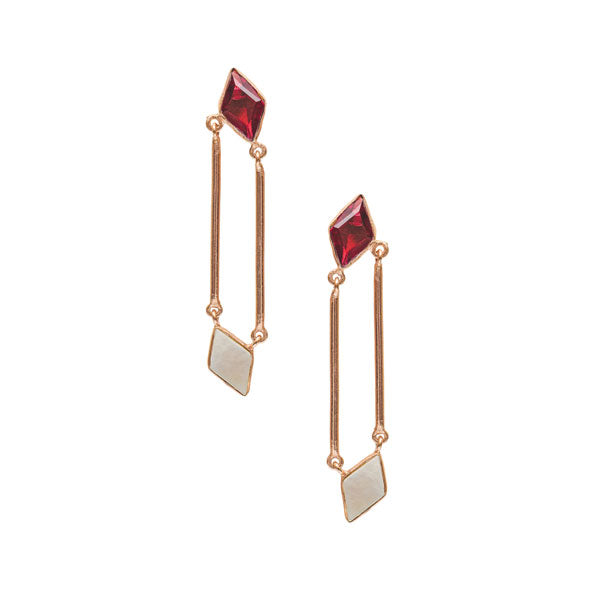 Rose Gold plated earrings with pink quartz & white mop semiprecious stone. Handcrafted in India.